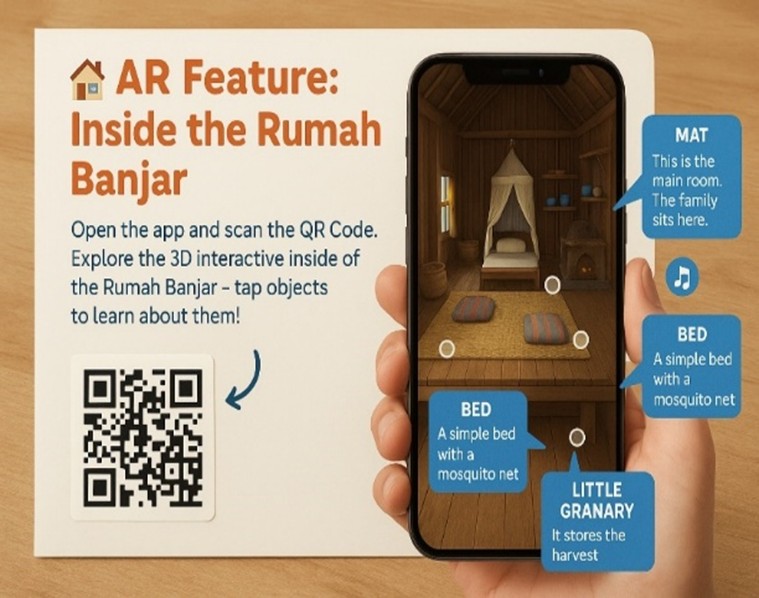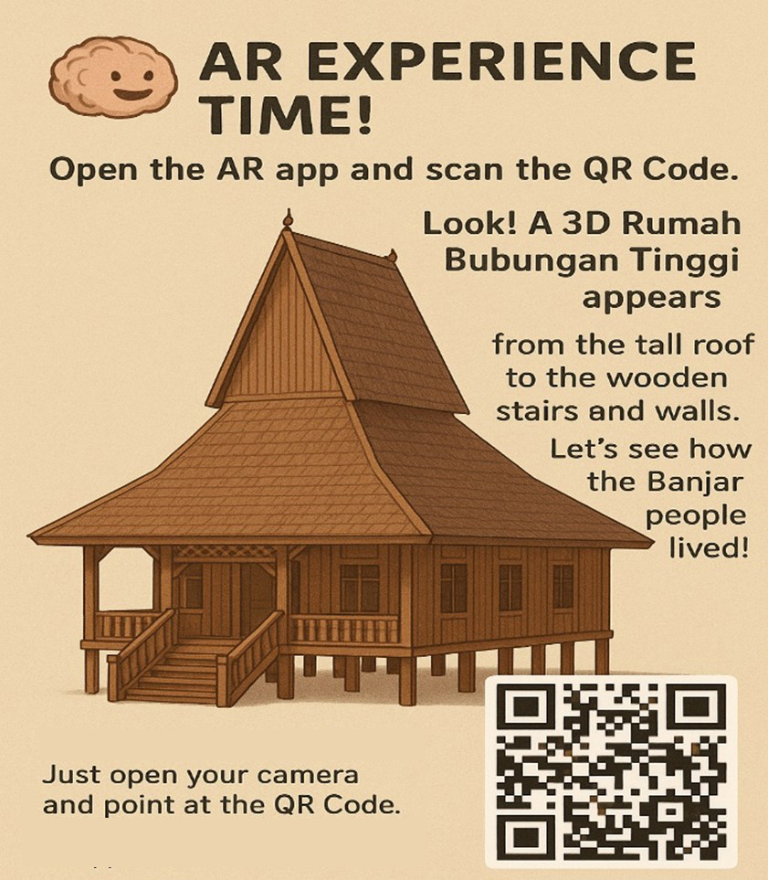E-book ini dirancang untuk mengenalkan kearifan lokal Kalimantan Selatan kepada generasi muda sejak dini. Melalui pendekatan bilingual (Bahasa Inggris dan Bahasa Indonesia) serta dukungan teknologi Augmented Reality (AR), anak-anak tidak hanya membaca dan melihat gambar, tetapi juga berinteraksi secara langsung dengan budaya lokal melalui animasi 3D, suara, dan permainan edukatif.