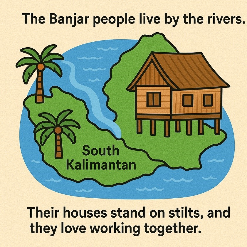 Orang Banjar tinggal di dekat sungai. Rumah mereka berdiri di atas tiang dan suka bekerja sama.