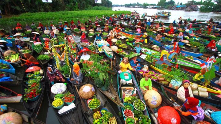 Yuk ke pasar terapung! Kamu bisa lihat orang menjual ikan, buah, dan makanan enak.