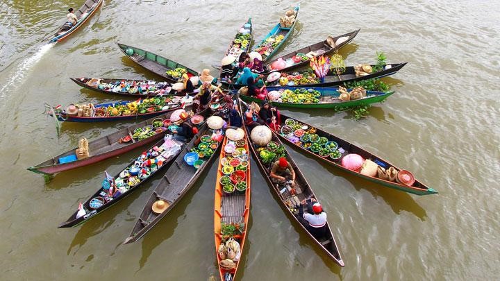 Let’s visit the floating market! You’ll see people selling fish, fruit, and yummy food.