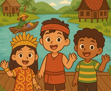 "Hello, kids! Today we will learn English while visiting South Kalimantan. It is a beautiful place in Indonesia. In South Kalimantan, there are big rivers, friendly people, and many unique traditions. Let’s say greetings and introduce ourselves while exploring this wonderful place together!"